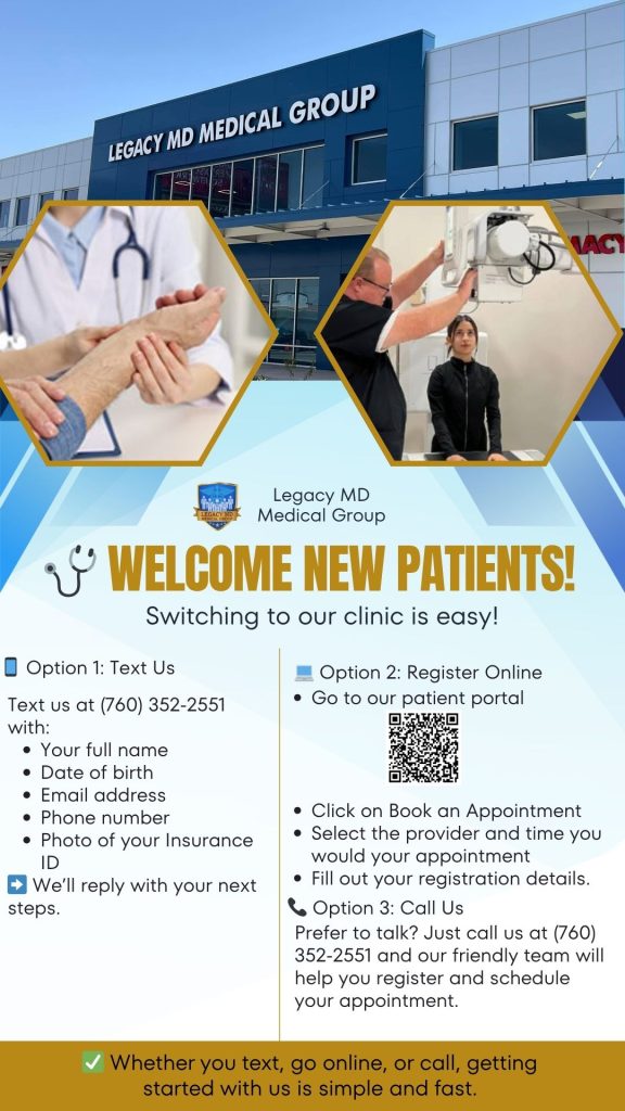 On behalf of the entire staff, we would like to welcome you to our clinic. Our team is here for you—not just today, but for every step of your health journey. If you ever have questions, concerns, or feedback, please reach out. Welcome to the Legacy MD family!